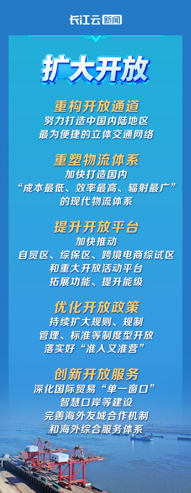 在扩大开放方面。湖北将坚持内外并重、“五措并举”,加快打造内陆开放高地,更好服务全国统一大市场、融入世界经济大循环。